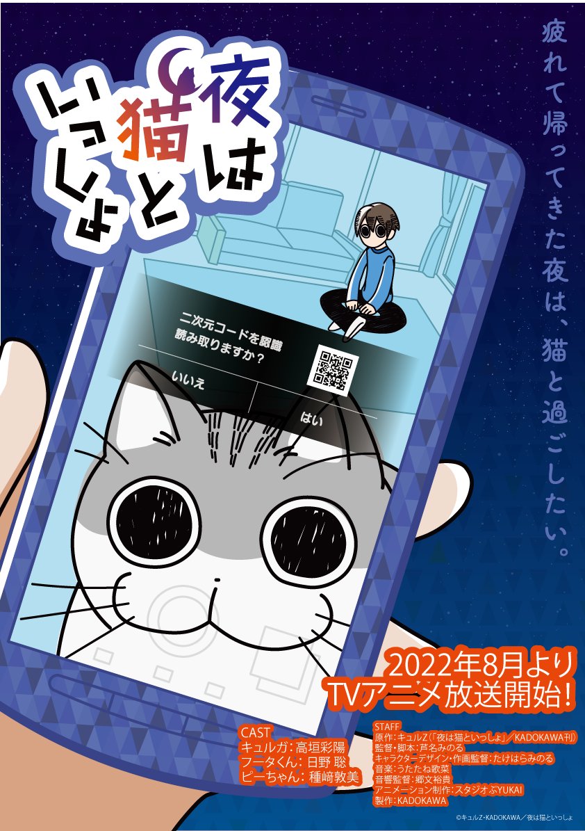在社群軟體twitter上爆紅的作品《今晚有貓伴身邊》,除了在twitter上看短篇漫畫外,也將在2022年的夏天播出動畫囉!社會人士的風太,有天妹妹小P帶了一隻奇妙的曼赤肯貓「咕嚕加」回來,沒有飼養貓咪經驗的風太,開始了與咕嚕加充滿驚喜的每一天。