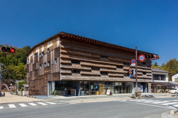 「小鎮驛站 檮原(Marche Yusuhara)」是隈研吾協同在地職人一同打造,一樓為物產館,二樓以上為雲之上飯店別館的複合型設施,最大特色是為外側的茅草建造,同時兼具散熱等功能。
