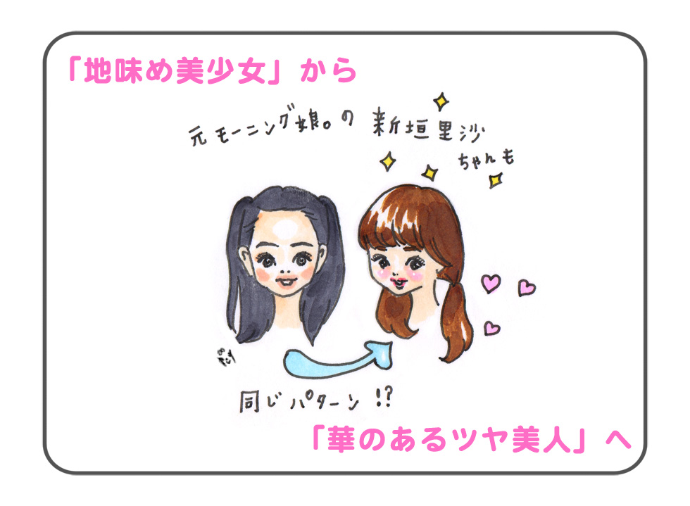 說到和石原聰美有同樣變化的藝人便是前早安少女組成員新垣里沙了。從在旁邊當配角的後輩到魅力十足的隊長,這當中不只是化妝或穿衣品味的改變,她確實也逐漸散發出受歡迎的氣場。
