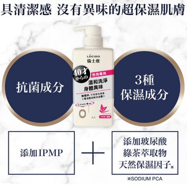 除了重視清潔的頻率外,挑對正確的沐浴產品才能徹底根除體味煩惱。日本Mandom集團針對30歲後半到50歲後半男性「熟男味(中年脂臭) 註1」的問題,推出熟男專用的洗髮、沐浴產品,除了原產品「倫士度頭皮去味洗髮精」與「倫士度去味沐浴露」,本季新推出秋冬適用的「倫士度零涼感去味沐浴露」,添加IPMP抗菌成分洗淨中年男性特有的高黏膩油脂、改善熟男味。此次新品除了移除原先涼爽的薄荷腦成分外,更添加玻尿酸、綠茶萃取物、天然保濕因子等三項保濕成分,在洗淨氣味的同時,也能於乾冷的秋冬保持肌膚水潤。