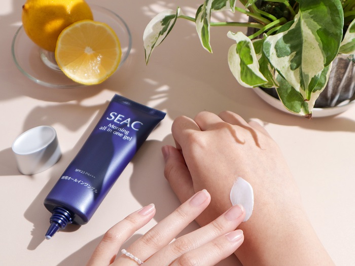 「SEAC欣可 日用全效凝霜」負責抵抗熟齡肌最怕的紫外線照射以及空氣髒汙,一瓶身兼防曬(SPF23,PA+++)、隔離霜與保養的功效。其中添加了6種精選膠原蛋白,以及精選4種植物水果精華供給肌膚水分保濕,利用了膠囊化防曬成分技術,減少防曬成分滲透肌膚內造成刺激與負擔。除此之外,日用全效凝霜內含柑橘精油香氣,聞起來十分輕盈且清爽,早上起床臉部清潔後使用,既輕鬆也撫慰身心。