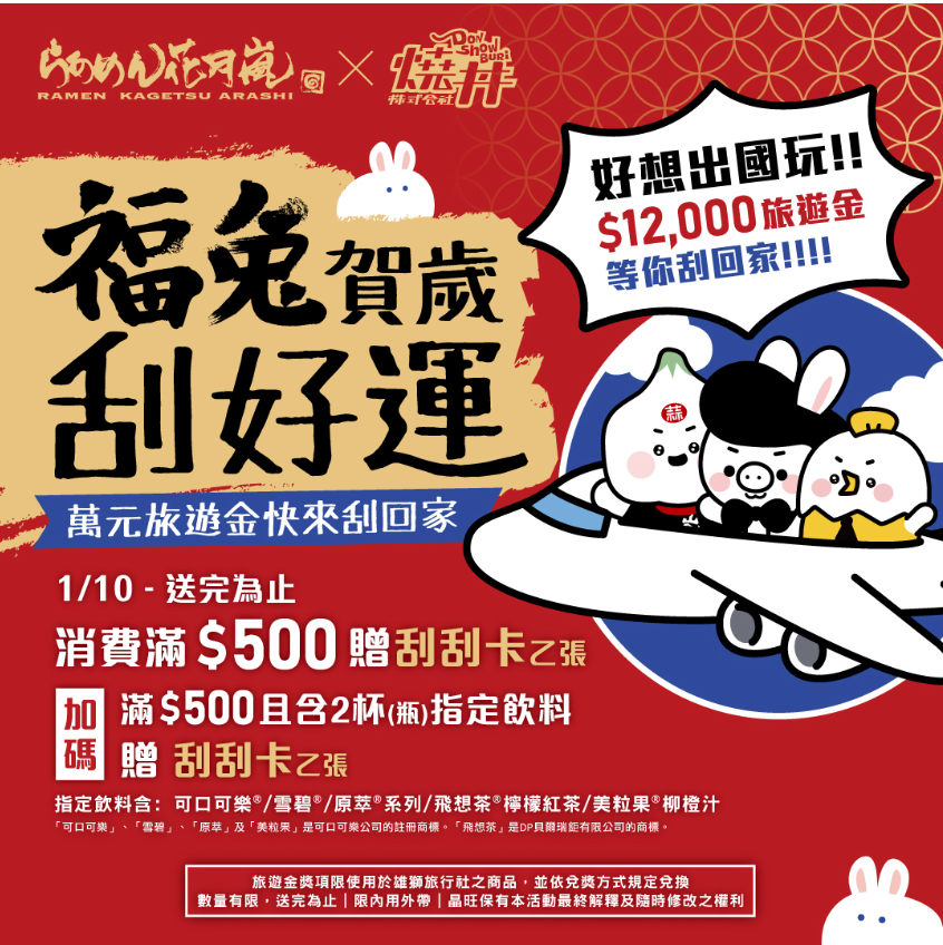 花月嵐與同集團餐飲品牌 「燒丼株式會社」攜手舉辦新年刮刮樂活動,祭出萬元旅遊金。1/10起至燒丼/花月嵐消費,就有機會將$12000旅遊金刮回家,另外還有免費大蒜拳骨拉麵、免費野郎燒豬丼等餐點優惠獎項,加持新年好運刮不完。