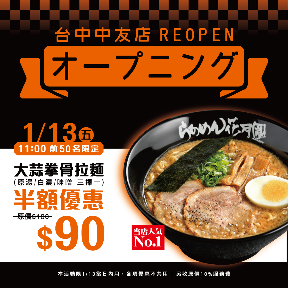 日本花月嵐拉麵台中中友百貨店即將於 1/13(五) 全新店裝亮相。 店內設有專用客席,開幕當天限額50名大蒜拳骨拉麵半價$90元, 拉麵迷們把握時間衝一波 !