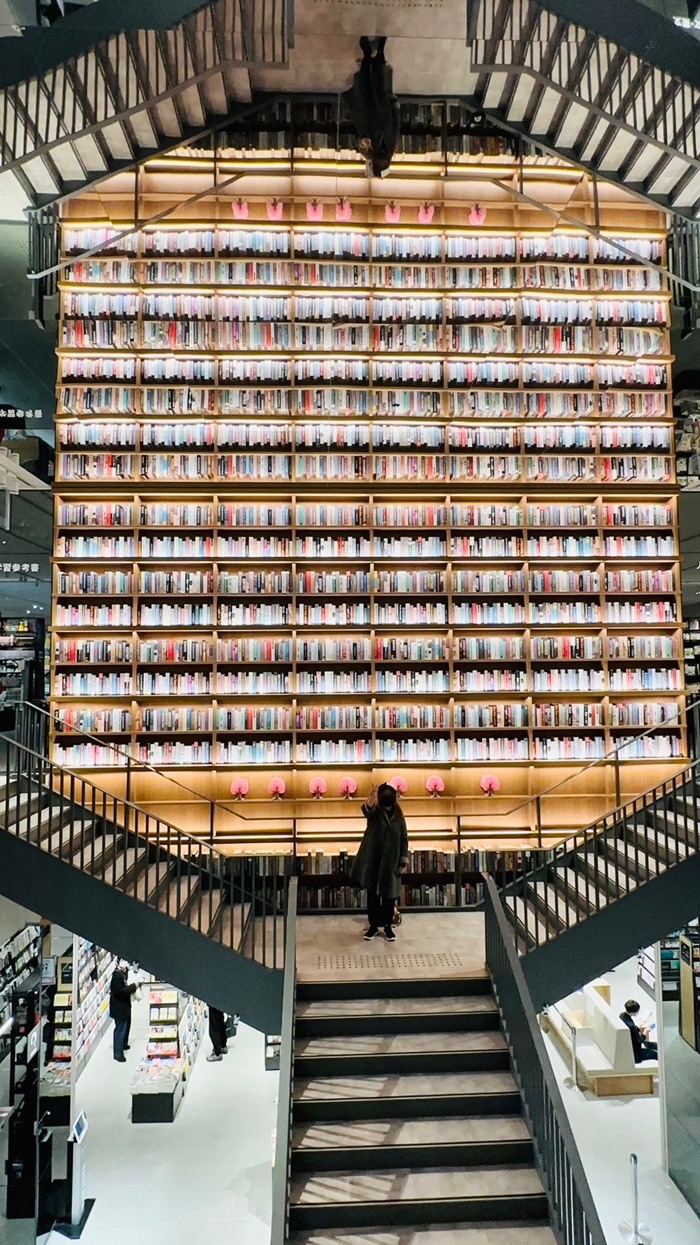 從下面這張照片可以很清楚的看到,其實書牆原本只有一層樓的高度,樓梯間二樓天花板的部分全貼上鏡子,整座書牆被鏡子的反射延伸成兩層樓高,善用從下往上的角度取景就能拍出像IG照片一樣的高聳連天的夢幻書牆。