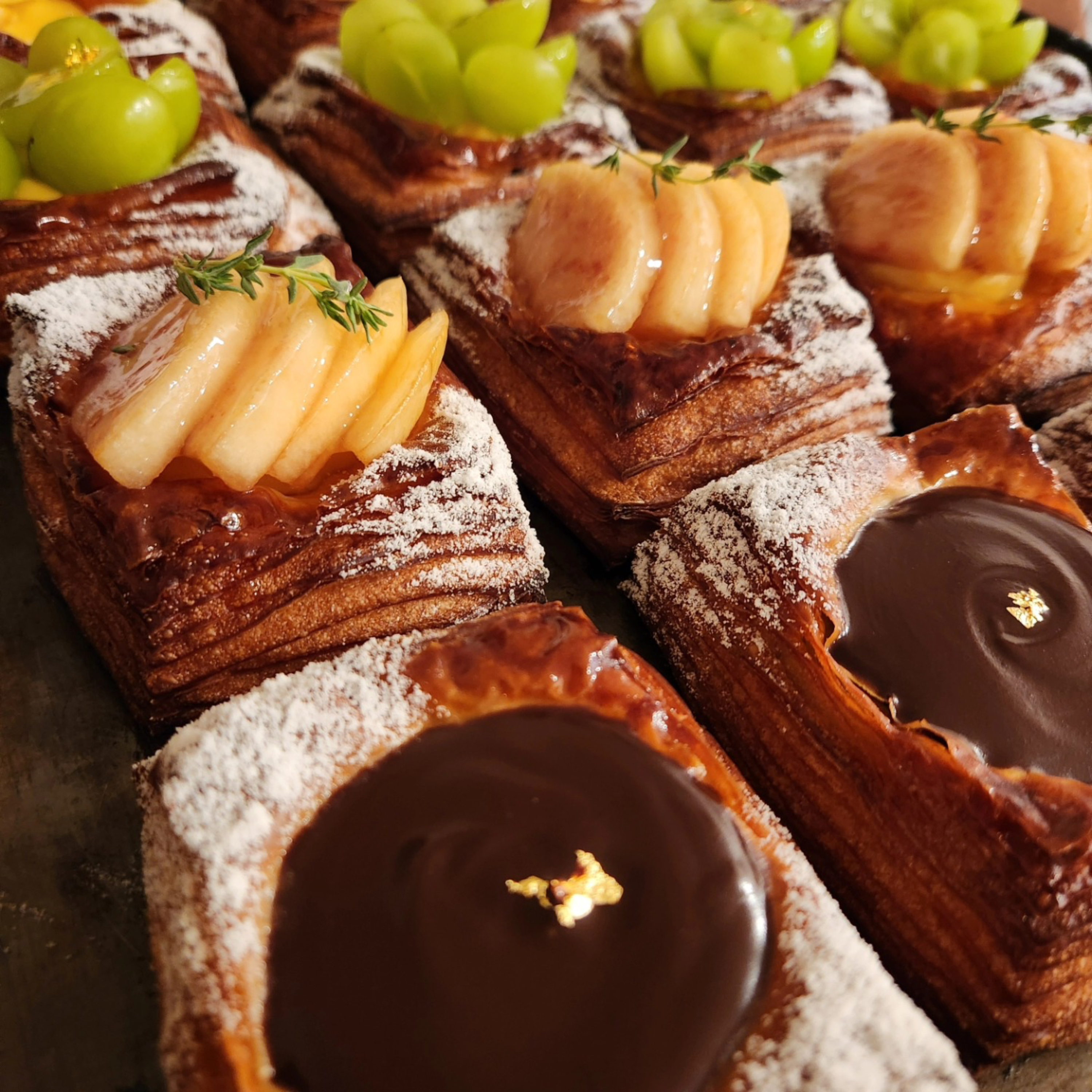 酥脆的丹麥派皮點綴新鮮水果的水果丹麥是甜點麵包類的人氣商品,鹹麵包類的話則以酸種麵包夾著火腿、特製白醬,再撒上起司焗烤的火腿三明治深受附近上班族的青睞喔!