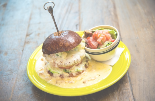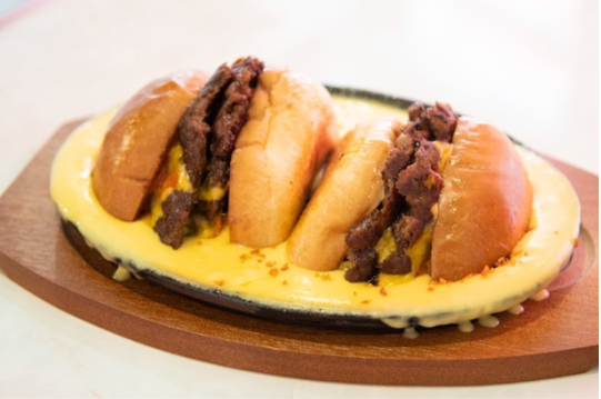 再來,則是位於東京台東區的「American diner ANDRA」,外觀是簡約的白色與紅色小棚子,有歐洲小店的感覺,人氣的餐點則是「Cheese in Cheese Burger」整份餐點使用了9片的切達起司的量,並且可以看到擺盤是讓漢堡整個泡在起司醬裡的,真的是令人罪惡感滿滿呀!