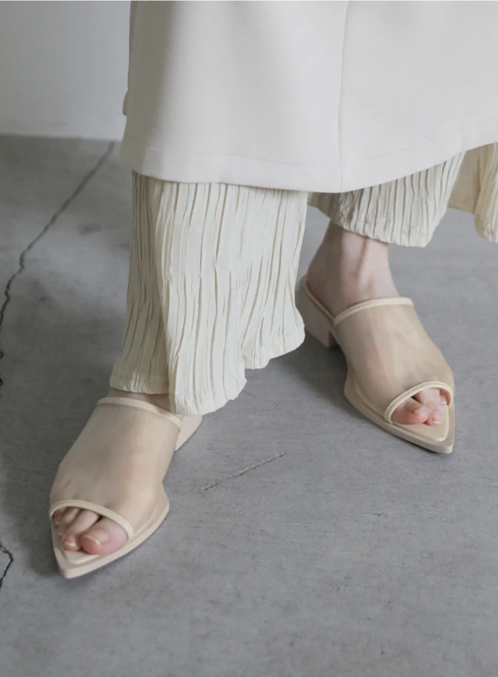 透膚單品在今年算是熱門關鍵字,微透肌的造型為夏季穿搭顯得輕盈舒適,以肩頭為主的涼鞋,加上透膚造型顯得相當時髦,尖頭款透膚涼鞋同樣能使雙腿製造修長感,運用同色系上衣與褲子的混搭,或者層次單品疊搭的造型技巧,充滿日本女生喜愛的穿搭風格,讓人輕鬆突顯聚焦的日系穿搭。