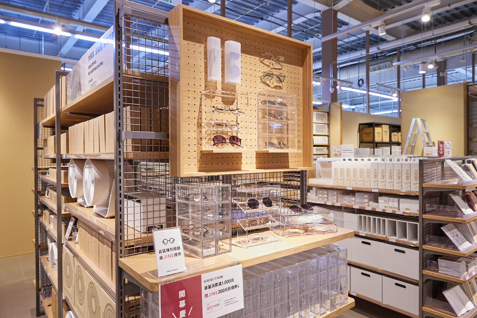 不僅環境氛圍能充分感受到雙品牌所帶來的各式各樣生活美學,產品與服務層面也展現互補及合作精神,例如:MUJI無印良品廣受好評的收納盒,設計簡約且實用,可用來收納JINS多種風格或功能眼鏡,還具有展示功能,可替生活增添一些儀式感;MUJI無印良品的顧客服務台,則擺放JINS老花眼鏡,便民服務,讓有需要的顧客,諮詢時不用擔心看不清楚問題。