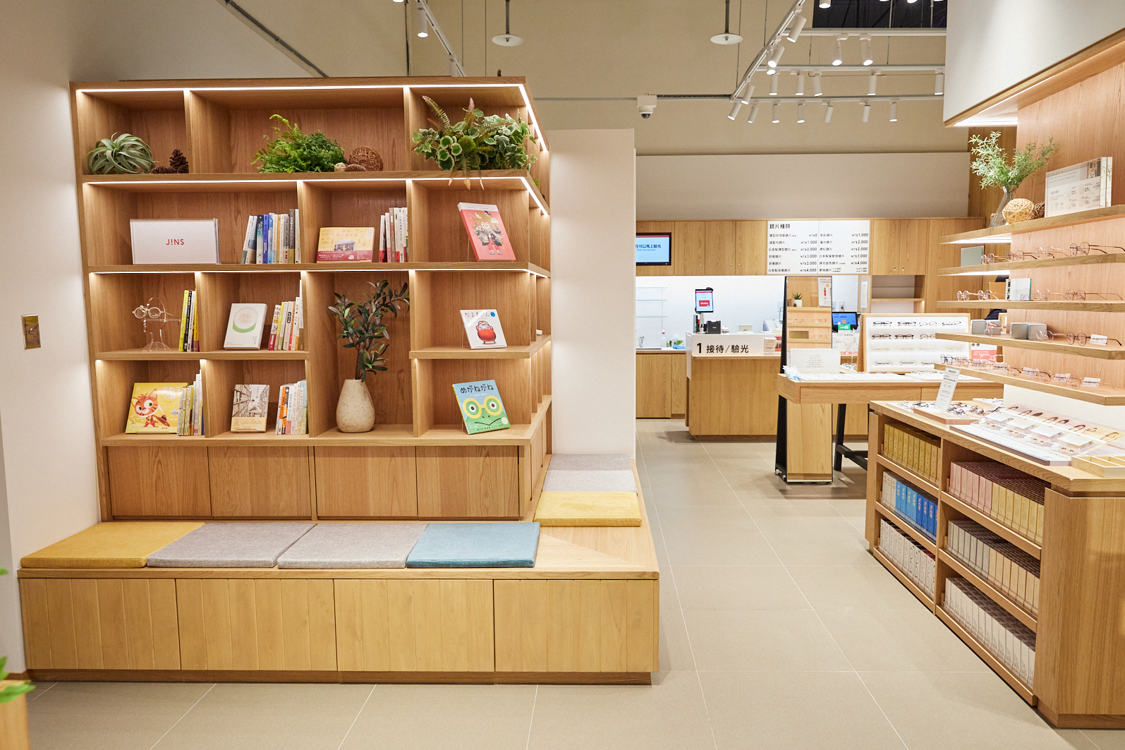 JINS本次與MUJI無印良品在台灣首次結盟,除了將讓購物感受更加完善外,兩間門市整體裝潢風格一致,門楣、防盜捲簾、展示櫃等細節處,都是相同色調、材質,呈現濃濃的日系簡約時尚氛圍,而靠近共用休息區牆面,JINS也特別設置大面積書櫃及座椅,供顧客隨時免費借閱。