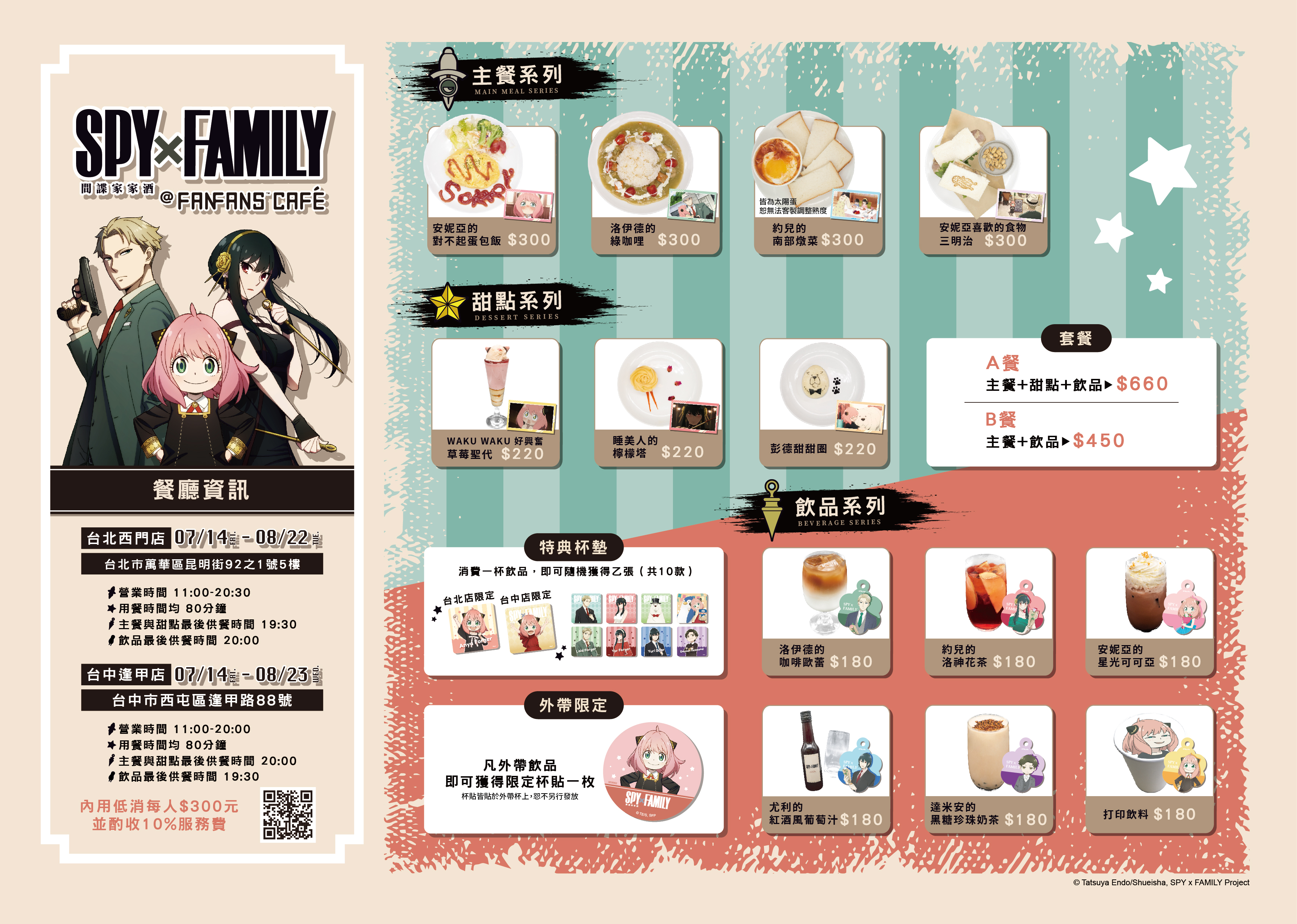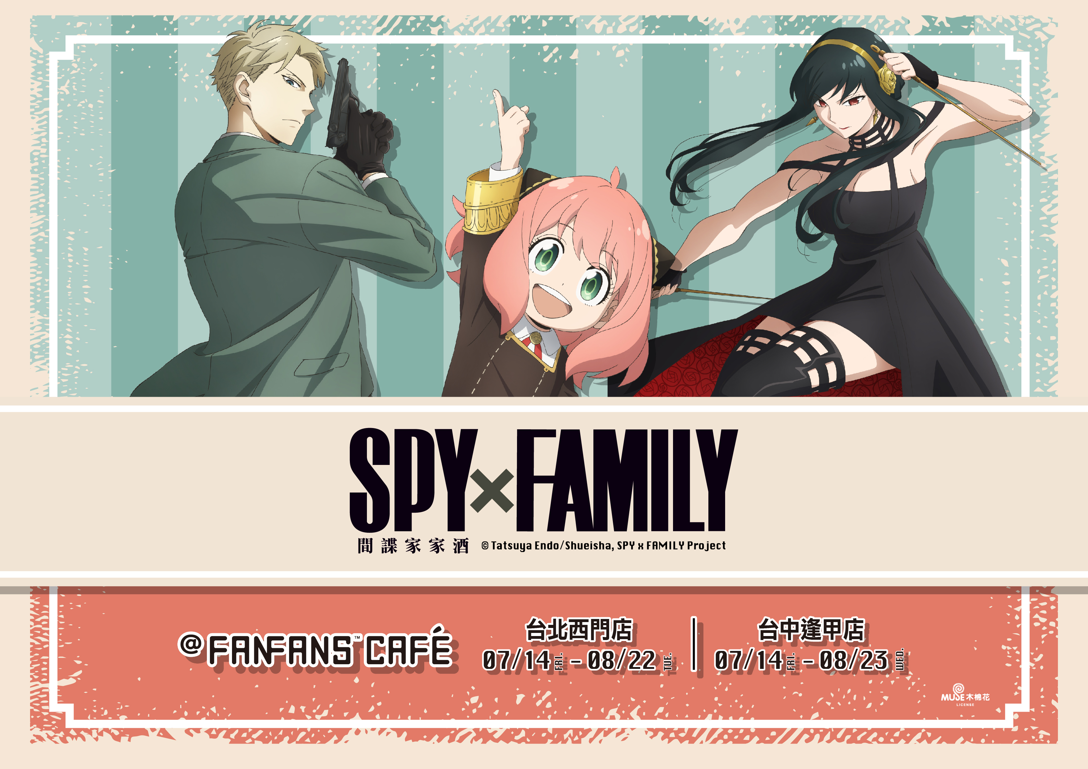 《SPY × FAMILY間諜家家酒》官方授權快閃主題咖啡廳全新開幕! 7月14日起,佛傑一家的餐點、商品即將現身「FANFANS CAFÉ」台北西門店和台中逢甲店,真的是WAKU WAKU 好興奮!除了安妮亞喜歡的花生之外,這次更還原了劇情裡出現的經典菜色,店內裝飾也充滿了溫馨可愛的佛傑一家,各位粉絲們,趕快手刀衝刺到FANFANS CAFÉ集合吧。