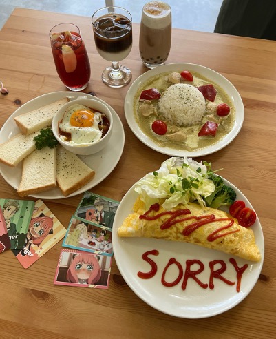 本次的餐點部分共推出四道主餐,三道甜點及六款飲品。像是還原為了讓安妮亞主動向達米安道歉,爸爸洛伊德所製作的「安妮亞的對不起蛋包飯」;加了章魚小香腸,還原度極高的「約兒的南部燉菜」;還有以安妮亞最喜歡的花生為發想,印上花生造型烙印、超級可愛的「安妮亞喜歡的食物三明治」,最後是以洛伊德的穿著設計的「洛伊德的綠咖哩」,契合洛伊德的帽子、領帶及西裝的視覺風格。