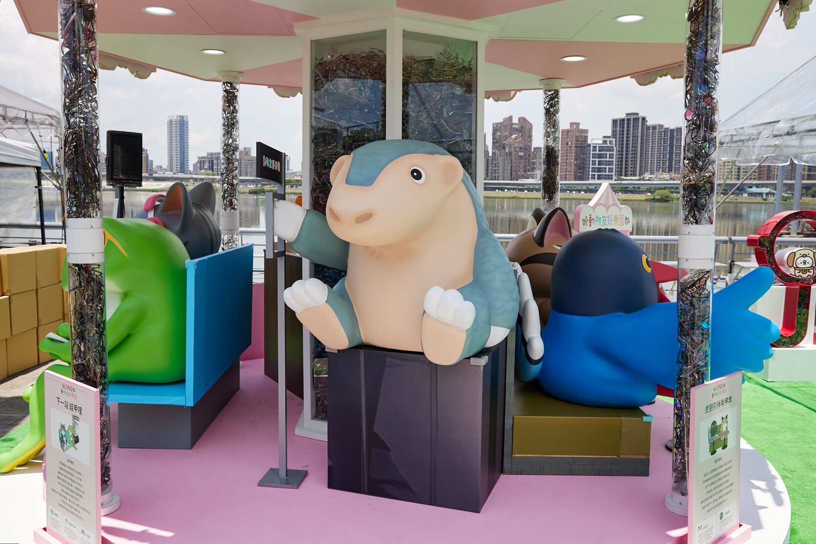 結合廢棄眼鏡所打造的旋轉木馬裝置物裡,有同桌開心聚餐的台灣特有種動物石虎、藍鵲,和舒服躺在床上的柯基犬,還有一起等車的穿山甲、虎斑貓、保育類動物金線蛙,透過擬人化行為,傳達動物平權理念,希望每個人都能站在動物的立場設想,不要漠視動物權益。