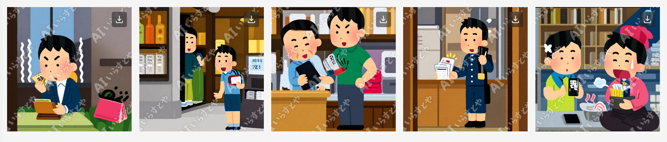 另外一個測試指令是「結帳時發現忘記帶錢包而感到尷尬的男性」,這個比起上面人數眾多的偶像大軍,好像更貼近指令一點,但是還是沒有像いらすとや原本圖庫裡就有的插圖這麼生動有趣。