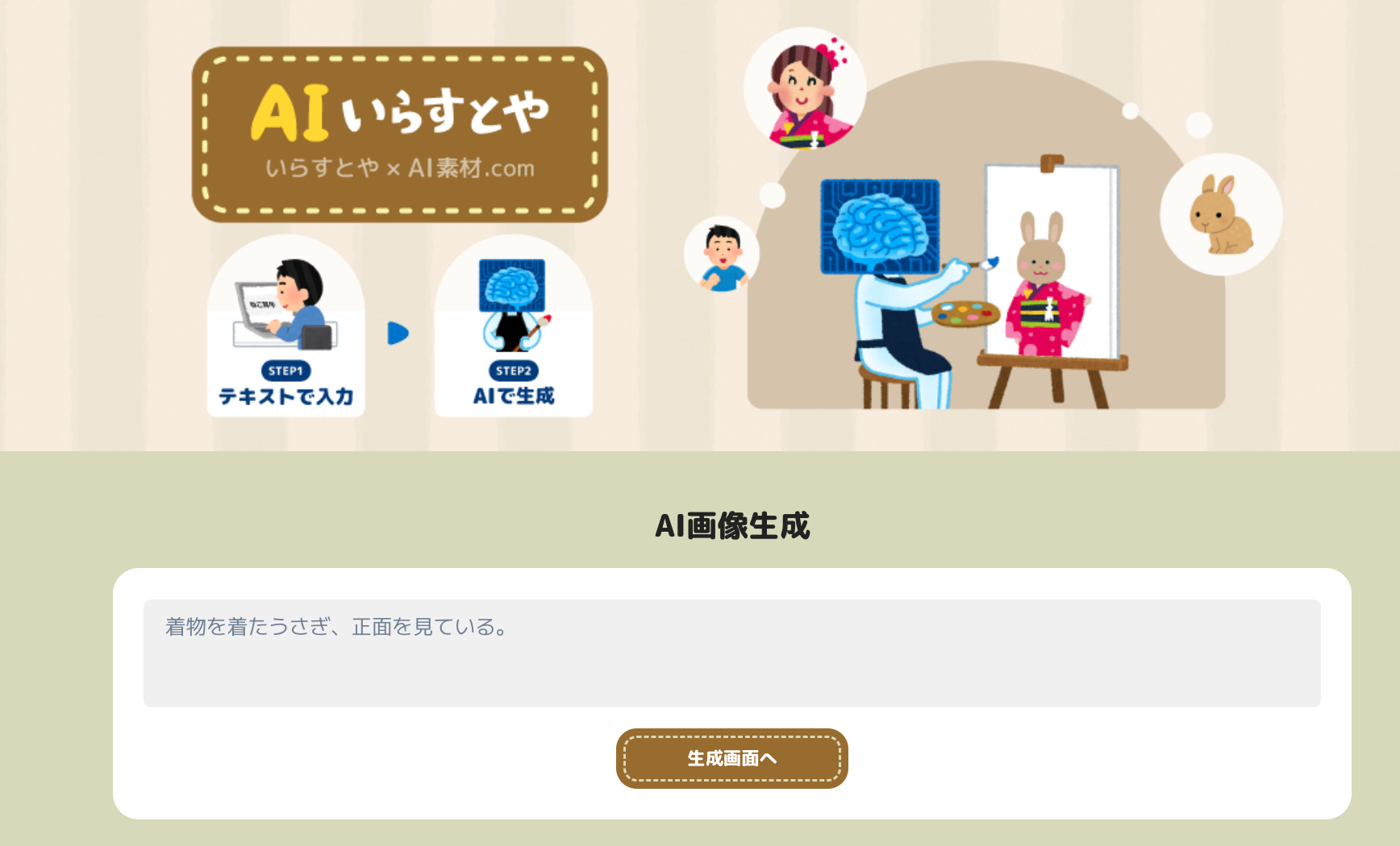 AI いらすとや針對AI素材生成的專屬網站,一進入網站就可以看到中間有一個輸入指令的話框。跟其他AI素材生成網站一樣,需要提供AI機器人一段需求素材的描述,接收到指令後,就會進入畫面生成。