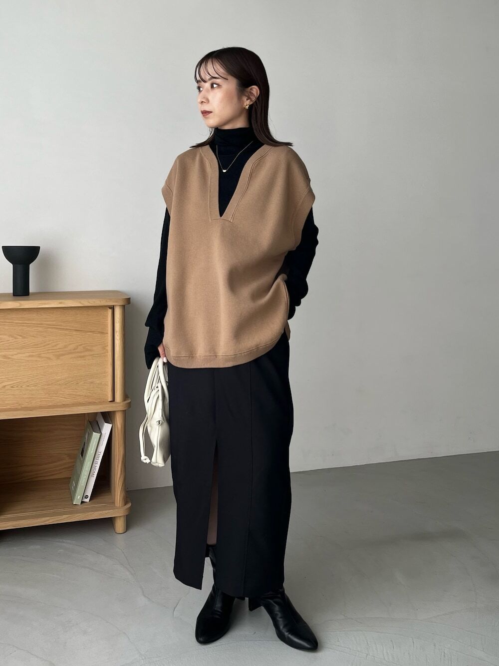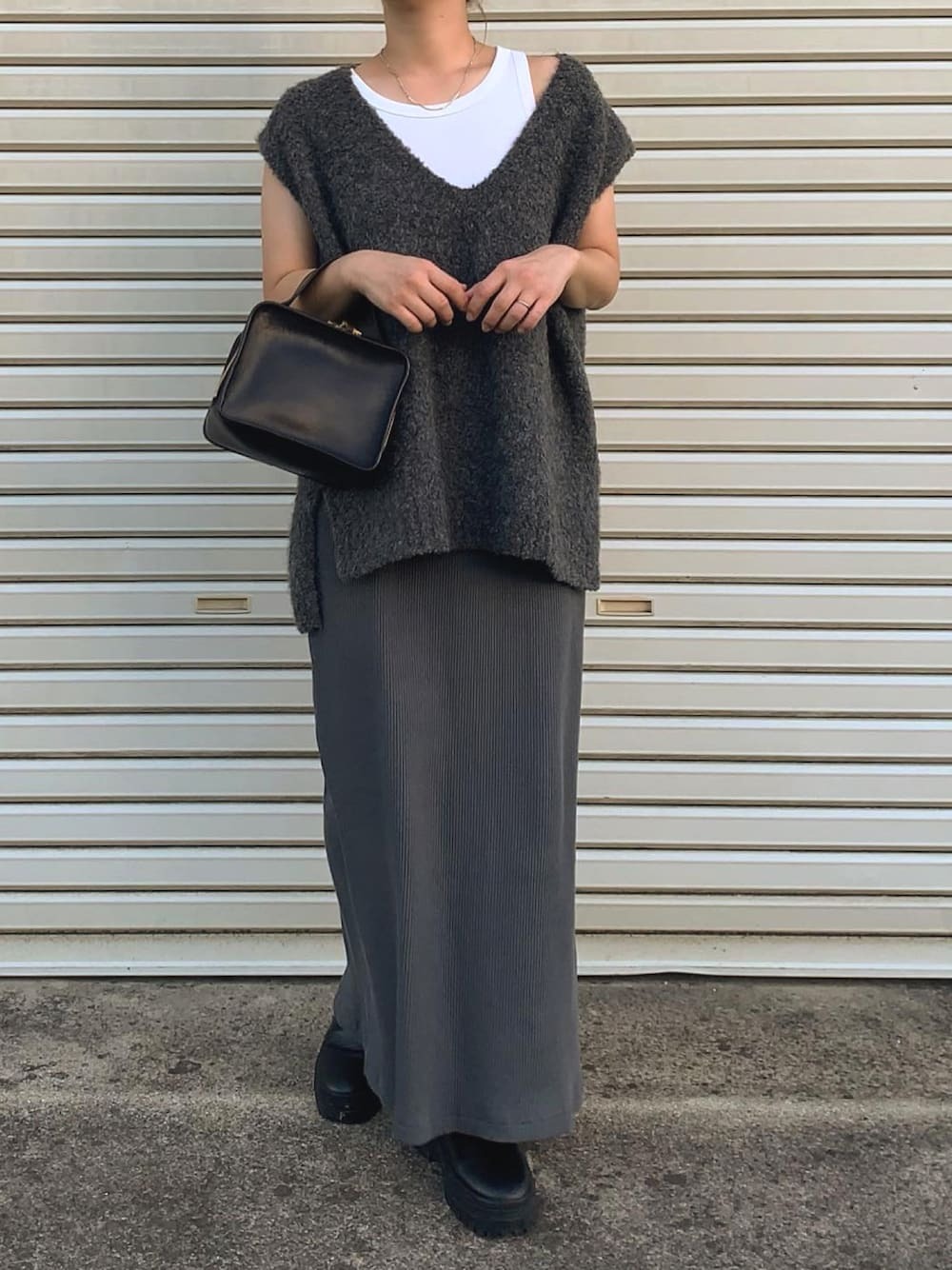 落肩剪裁針織背心,穿著時能使肩膀增加顯瘦度,結合 V 領剪裁更為脖子與臉部線條帶來小臉感,以 V 領剪裁針織背心 + 長裙,使整體看起來纖細又顯高,希望讓身形更修飾的話,可以透過黑色系上衣和長裙加乘,高階版的穿搭組合一定要學會。