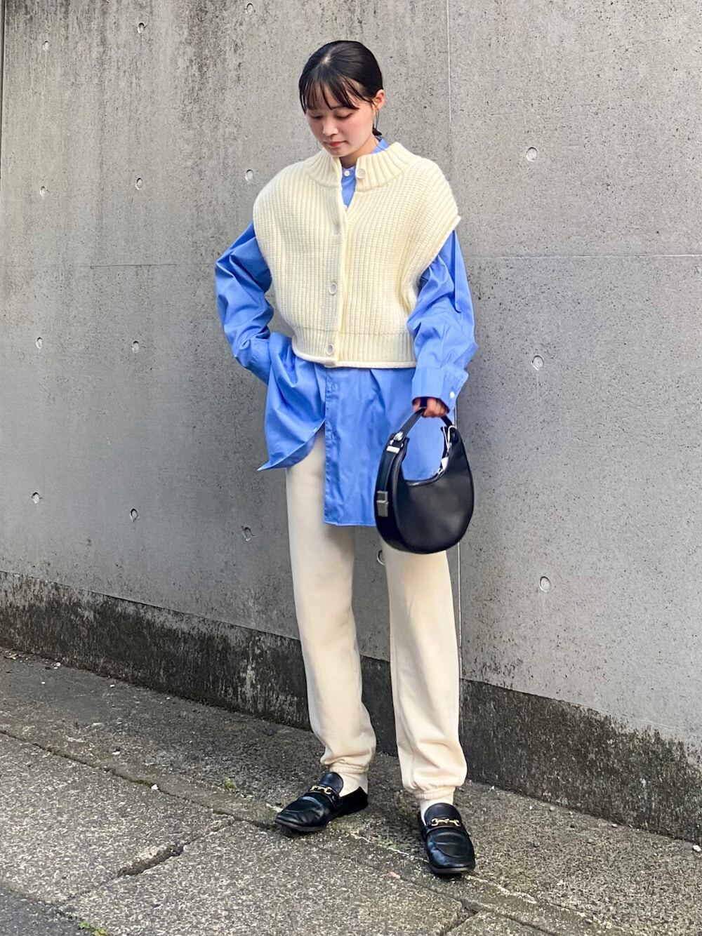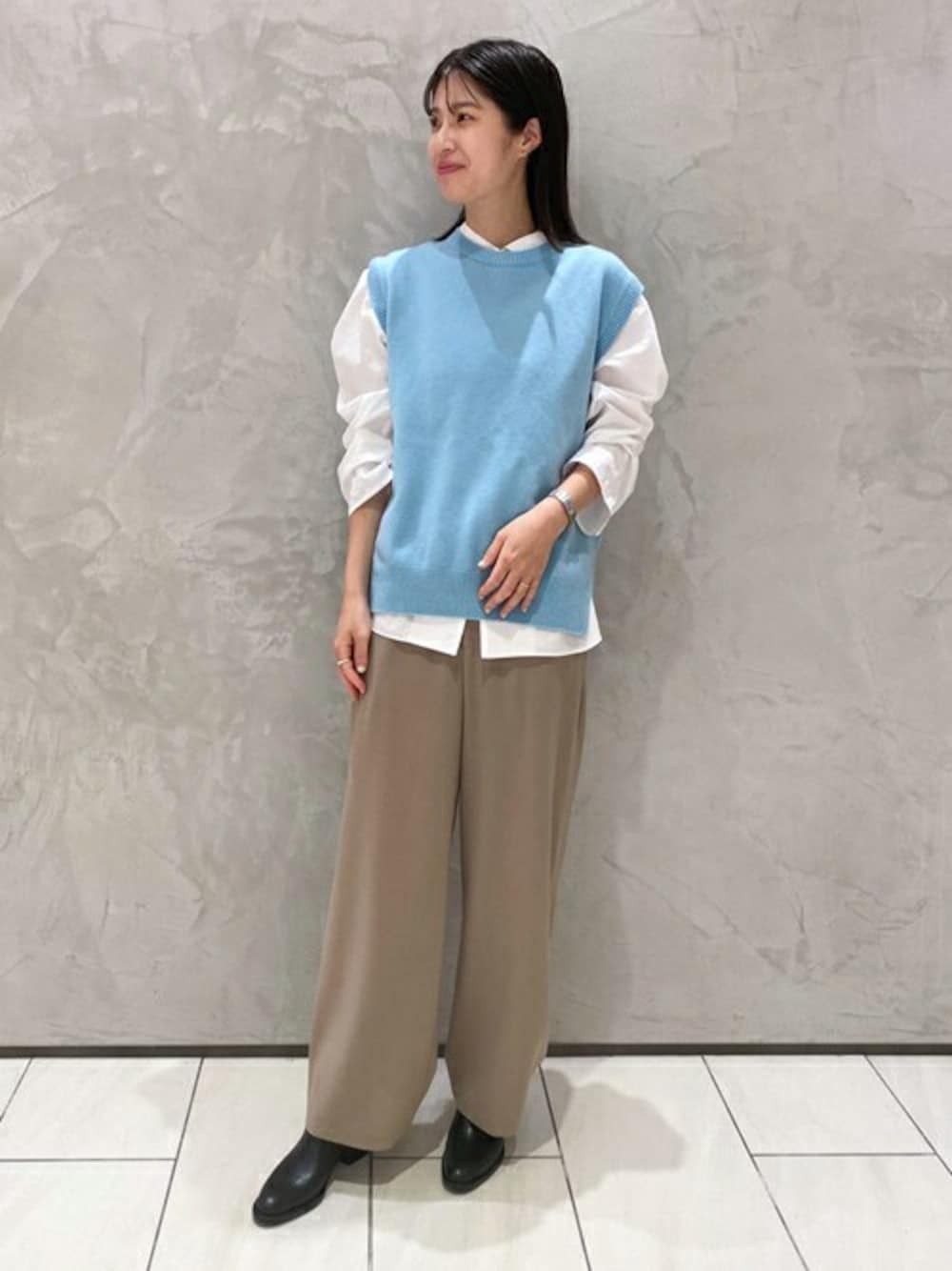 當想呈現大人感通勤穿搭時,選擇針織背心 + 襯衫,運用直條紋或者立領襯衫,營造知性成熟日系感,利用白 X 藍的撞色系混合,為衣著帶來一股視覺豐富的注目效果,下半身以軟質料西裝長褲搭配,簡單展現迷人 OL 風格。