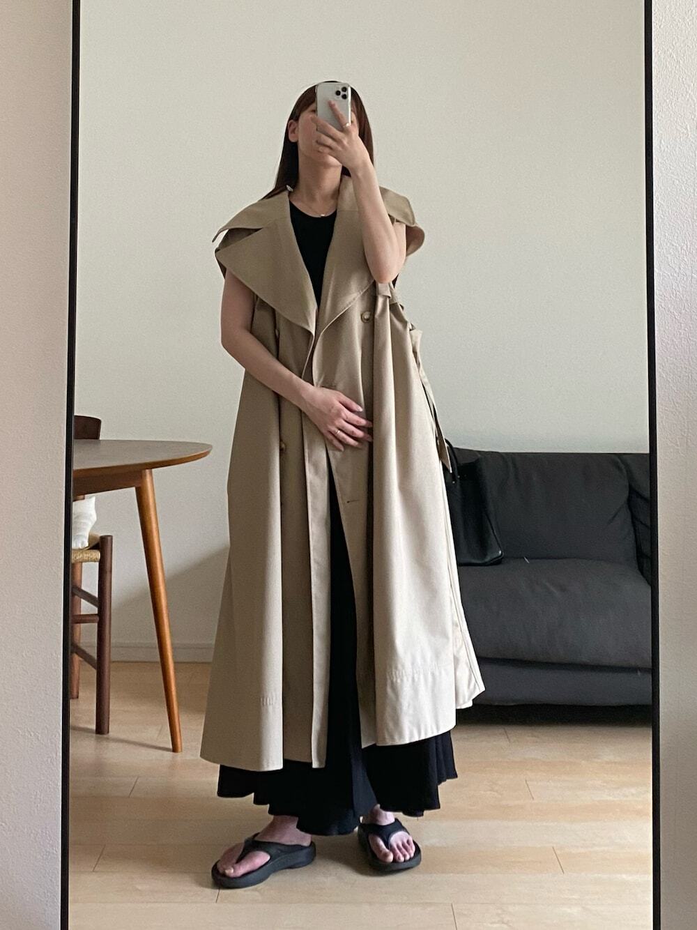 剛進入秋季時,非常推薦選擇背心長版風衣連結衣著溫度,運用大領片或者傘狀下襬的剪裁,使整體看起來層次注目度加倍,製造與眾不同的秋季風格,內搭無袖、坑條短袖上衣搭配長裙,讓造型呈現一股溫柔女子的日系印象。