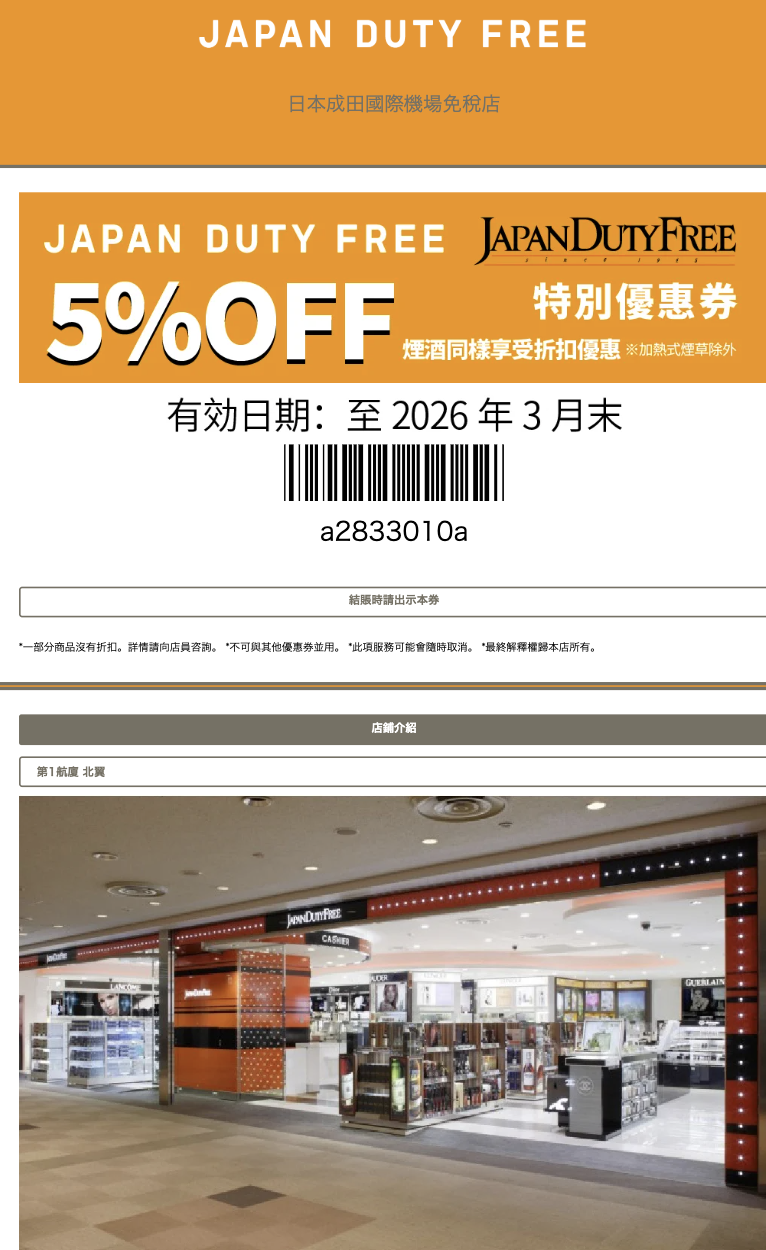 2025年最新成田機場「JAPAN DUTY FREE」優惠券