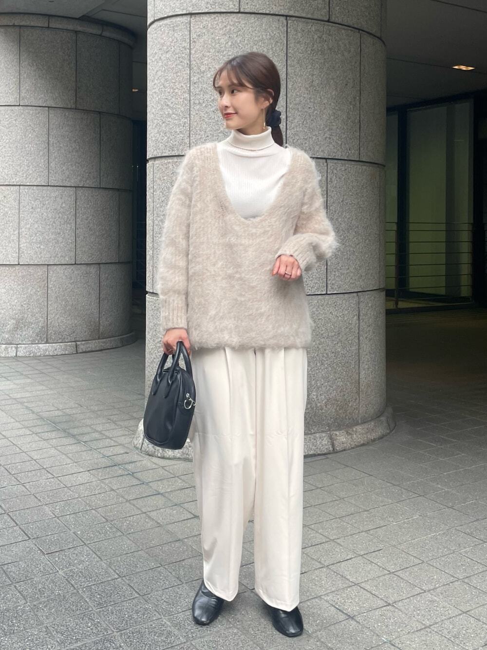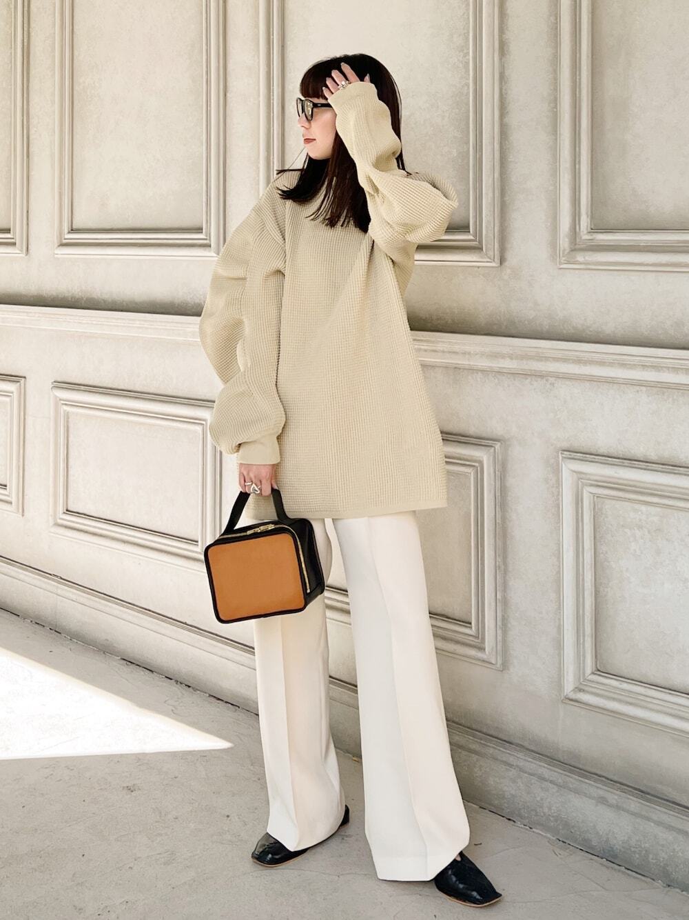 以白色、奶油、杏色為基礎的搭配,結合類似色混搭技巧,使造型擁有一股舒適自然的氣息,並利用溫暖感的針織上衣加乘,連結溫柔優雅的迷人質感,隨性加上手拿小包或靴子,便能輕鬆優雅上街。