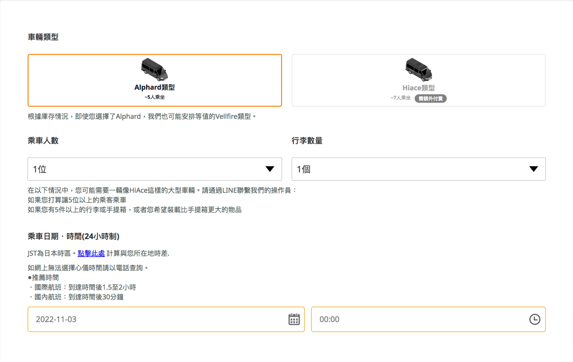 阿爾法車型能容納5人,Hiace車型能容納7人。然後再輸入乘車人數及行李數量資料,再選擇乘坐日期及時間,最後填寫聯絡人資料。