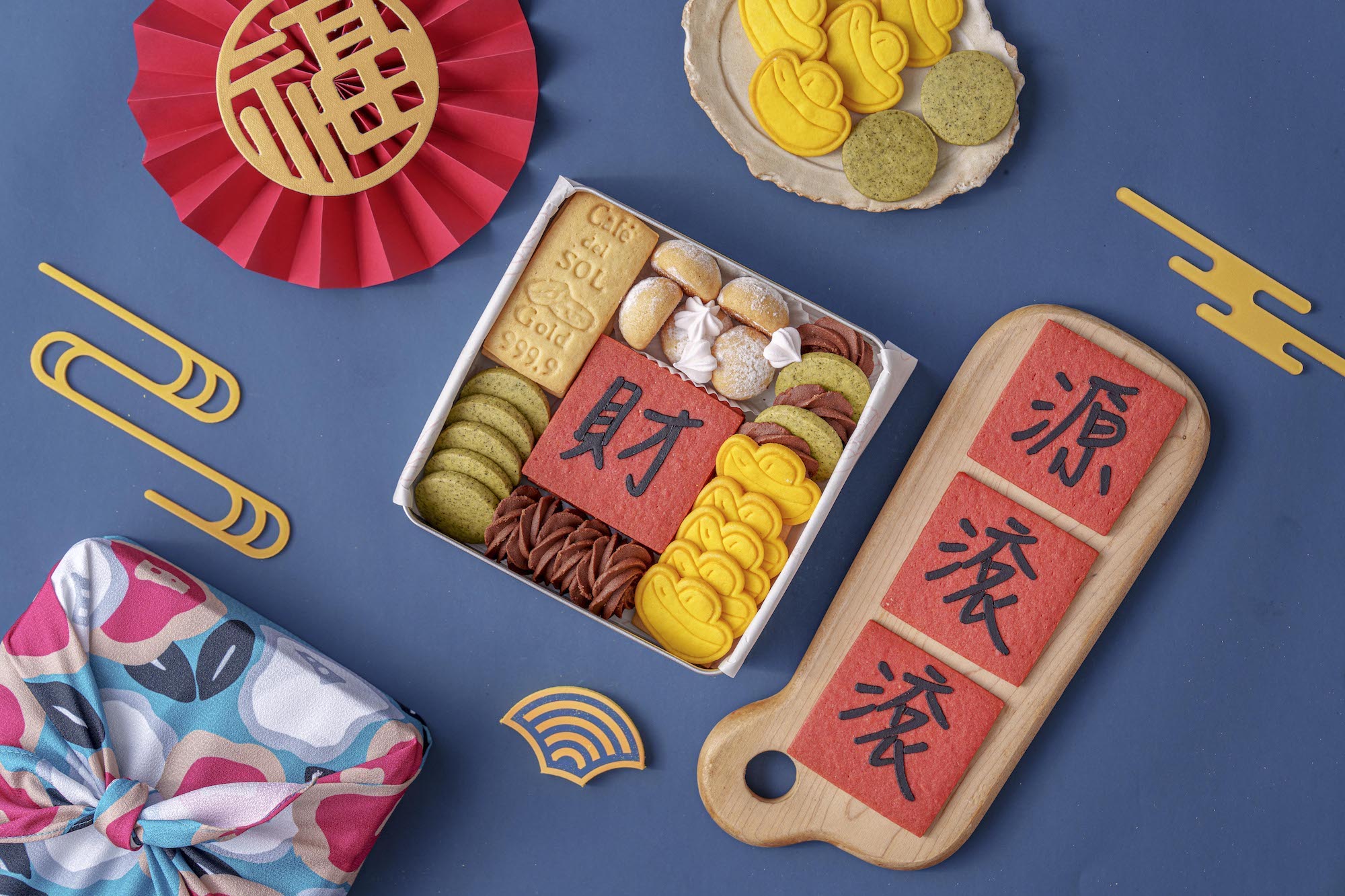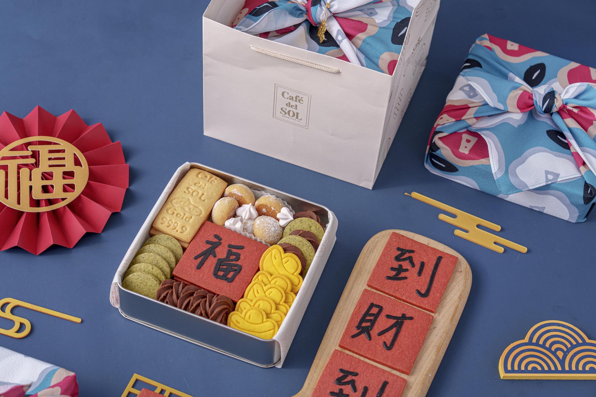 Café del SOL超人氣的新年禮盒今年來到第四年販售,這次一共推出三款新年手工禮盒:財源滾滾、五福臨門、迎春納福,可以讓大家依照喜好和心情做選擇!東方的新年元素搭配西式的美味小點,內外兼具又富有創意,保證讓你送禮送到心坎!別再猶豫,快點一起把吉祥和好運帶進家門、吃下肚!