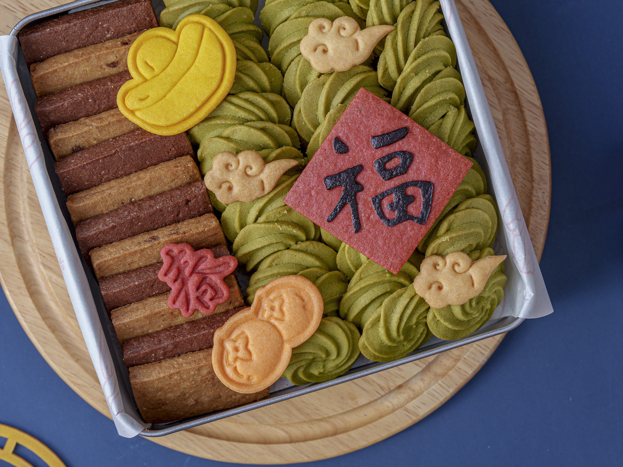 五福臨門手工禮盒內含:靜岡抹茶曲奇、比利時巧克力曲奇、檸檬元寶、檸檬星星、草莓甜菜根、祥雲奶酥脆餅。香濃的抹茶和巧克力香氣包準讓你愛不釋口!