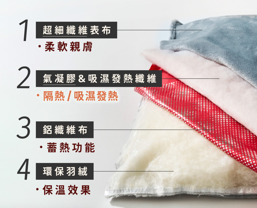 搭配上「鋁纖維布」保持保溫與蓄熱效果,以及「超細纖維表布」柔軟親膚的觸感讓冬天進被窩迅速溫暖!