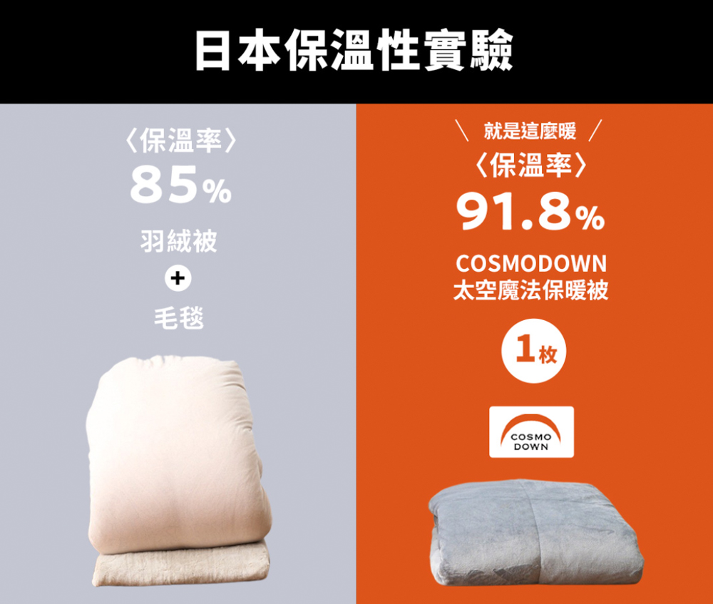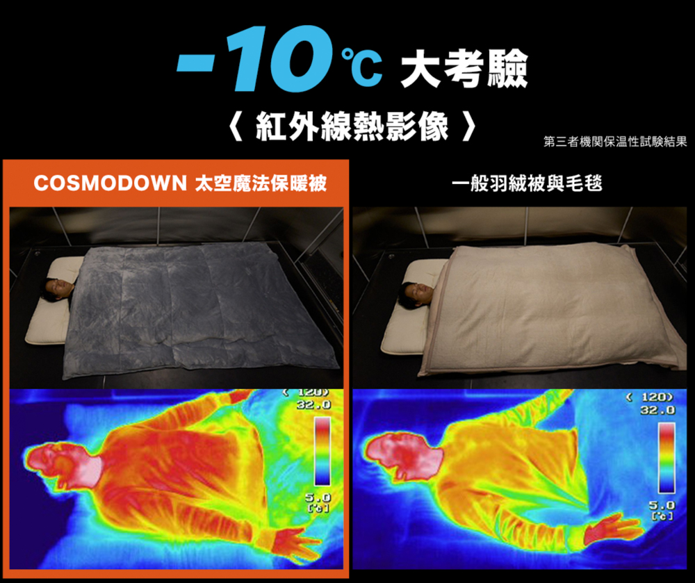 從紅外線熱影像可以看得出來,單單一條COSMODOWN的保溫率明顯比一般羽絨被再加上毛毯的保溫率要好非常多,經過測試結果,COSMODOWN用過往過冬棉被的1/4厚度,就輕鬆達到91.8%的保溫率。
