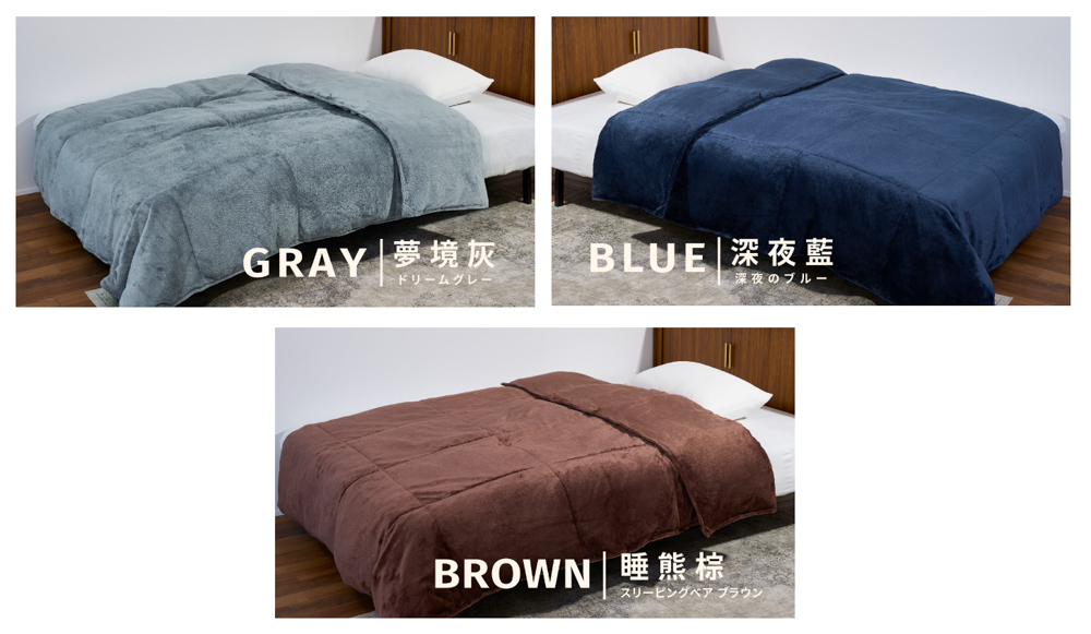 本次首次登上台灣的FlyingV募資平台,MORIRIN特別準備了日本熱銷的3種顏色:夢境灰/深夜藍/睡熊棕,並推出單人被以及雙人被供台灣的消費者選擇,希望能將心血結晶的好商品帶給台灣的客人!