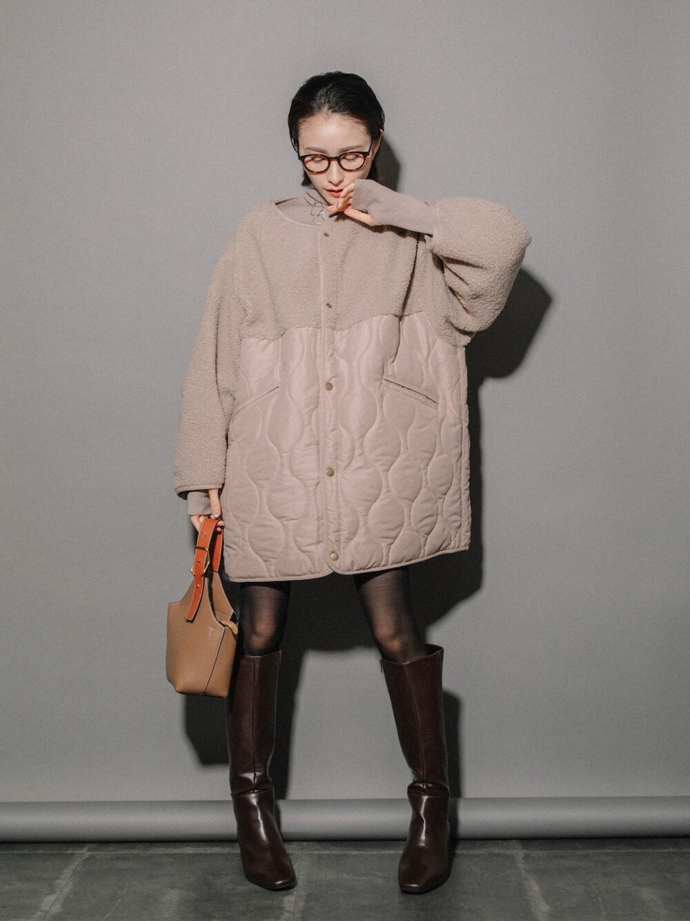 喜歡女孩感風格的大家,嘗試選擇寬鬆 Oversize 設計絎縫外套為搭配,利用單穿造型表現方式,為整體注入一股微辛的衣著焦點,彷彿將外套當作洋裝穿的心機混搭,看起來甜美又兼具個性感受,鞋履選用皮革或者麂皮長靴,同時讓身形擁有顯瘦高挑的修飾度。