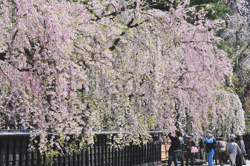 秋田的角館是江戶時代繁盛的城下町,又有「陸奧小京都」之稱。從角館站下車步行約15分鐘即可抵達以罕見的「枝垂櫻」而知名的賞櫻勝地「角館武家屋敷」。這裡由多個武士宅邸所組成,沿著宅邸間街道有著約400棵的枝垂櫻樹,其中還有162棵被指定為日本國家天然紀念物。夢幻的枝垂櫻與武士宅邸的黑牆相映襯,路上還有人力車穿梭,有如進到江戶時代一般風情滿點。