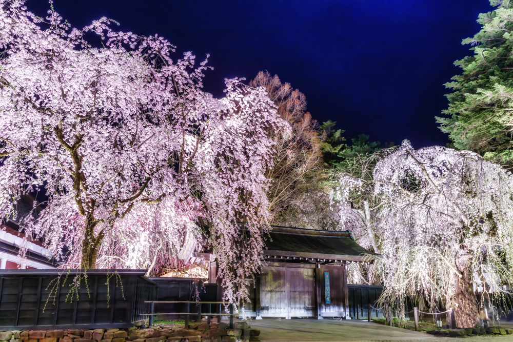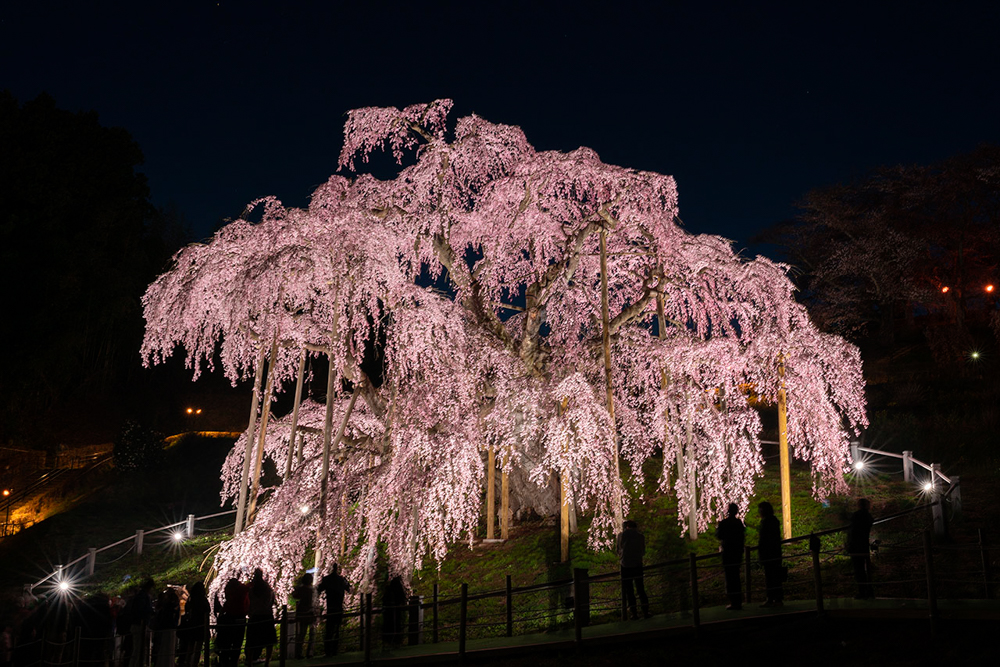 有別於以數量取勝的賞櫻景點,「三春瀧櫻」僅以一株紅枝垂櫻便成為知名的賞櫻勝地。三春瀧櫻是位於福島縣三春町的一株紅枝垂櫻,也是「日本五大櫻」和「三大巨櫻」之一。三春瀧櫻樹齡超過1,000年,並且樹高達約4層樓,水平長度更是超過20公尺,盛開時櫻花有如瀑布ㄧ般傾瀉而下,魄力滿點。花季期間的夜晚還會打上燈光,可以欣賞到與白天截然不同氛圍的三春瀧櫻。
