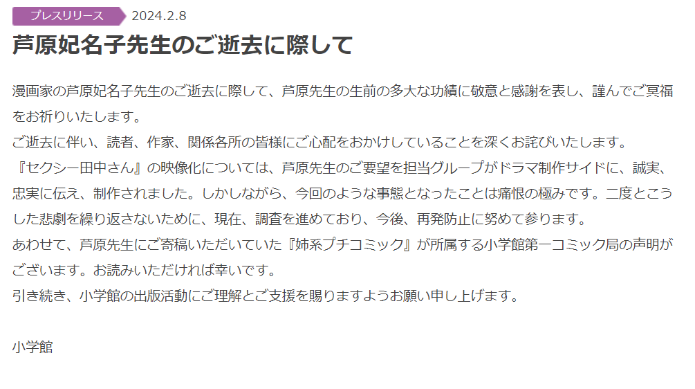 小學館編輯部在2月8日發表共同聲明來悼念蘆原妃名子,會著手調查此事外,並且未來的影視化過程中,將以保護原作者為優先,並提出更好的建議,以修正改進與電視劇組的溝通方式。