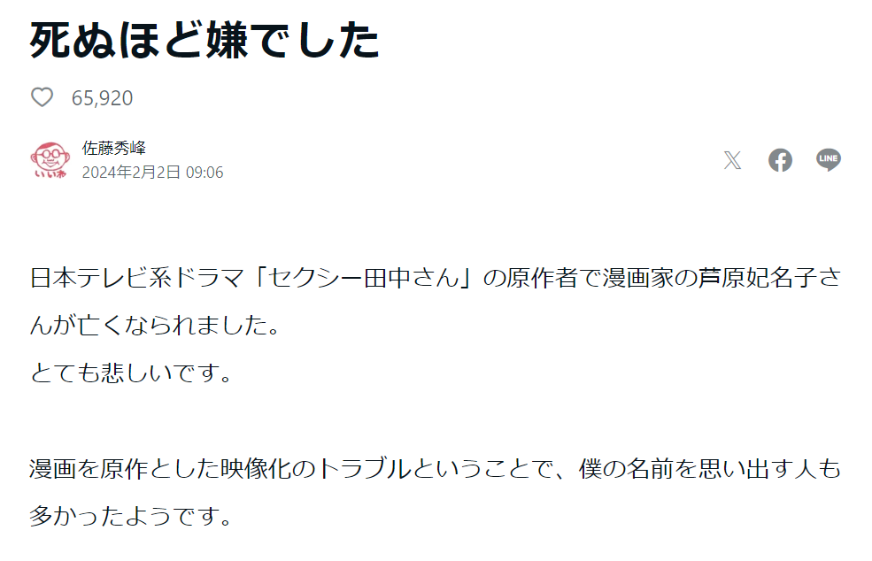 在蘆原發文之後,網路上的發文風向大多支持蘆原,許多漫畫家也發文支持;而日本電視台出現了多則意圖指責蘆原的新聞,蘆原妃名子在刪除社群上的貼文後,發了一則道歉貼文表示她並沒有要傷害任何人。但在2024年1月29日,蘆原的遺體在栃木縣日光市的水庫被發現。