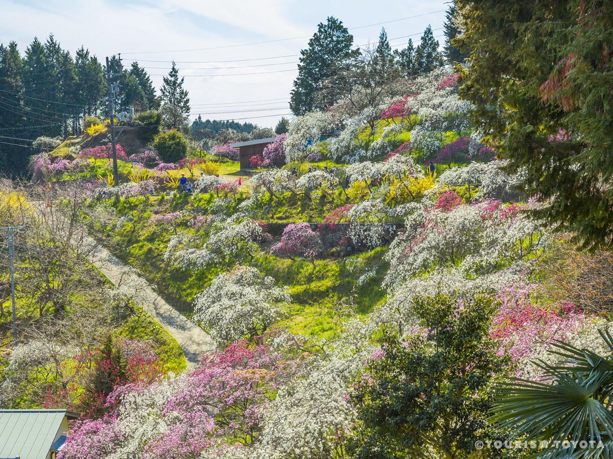 愛知縣豐田市位於名古屋以東車程約1小時的地方,顧名思義,這裡是豐田汽車總公司的所在地,面積是愛知縣內最大,除了佔全市七成的森林,還有生產許多蔬菜水果的廣闊田園,是自然資源豐富的地區。著名的觀光景點有以楓葉聞名的「香嵐溪」,以及在秋天綻放的櫻花「小原四季櫻」,不過春天不只是櫻花,還有許多可以欣賞各種不同花卉風景的知名景點。希望大家遠離都市喧囂,在大自然裡欣賞色彩繽紛的花卉風景、呼吸清新空氣的同時,也請充分感受日本的春天