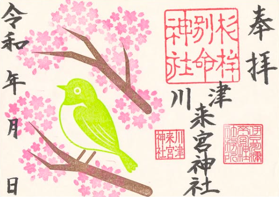 位於靜岡縣河津町知名河津櫻觀賞景點旁的「川津來宮神社(川津来宮神社)」是前往欣賞河津櫻者都會前往參拜的神社之一。來到川津來宮神社參拜時,可以購入這個 2 月限定的御朱印。特別繪製的櫻花樹下還有著守護神明安全的小鳥圖案,充分呈現了川津來宮神社的神話精神。