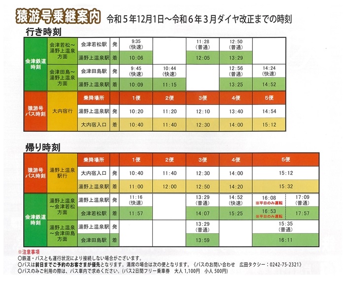 以下就去大內宿會用到的部分作介紹:如果只是要去大內宿玩個半天的話,會需要用到西若松~湯野上溫泉站的鐵道乘車票+湯野上溫泉站~大內宿的猿游號巴士,因為巴士採取預約優先制,所以如果在旺季的話,建議先看好時間表然後在官網上預約(目前只有日文版網站),不過沒有預約的話也是可以搭乘的。