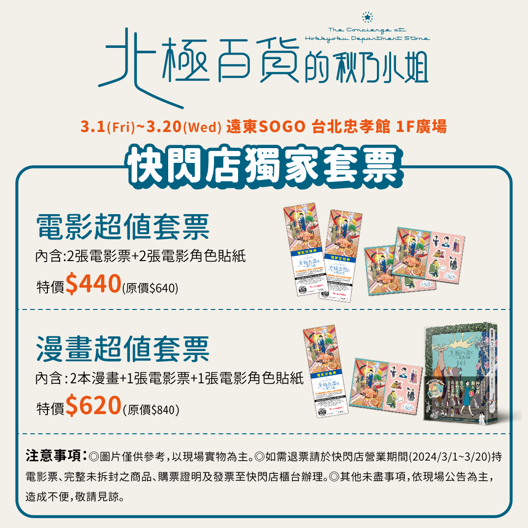 本次快閃店也特別推出限定電影套票,內容包含首度中文化的《北極百貨的秋乃小姐》漫畫特裝版、電影票一張及限量電影角色貼紙一張,喜歡溫馨又奇幻電影的粉絲們一定要收藏!《北極百貨的秋乃小姐》電影3月15日全台上映,期待您的光臨。