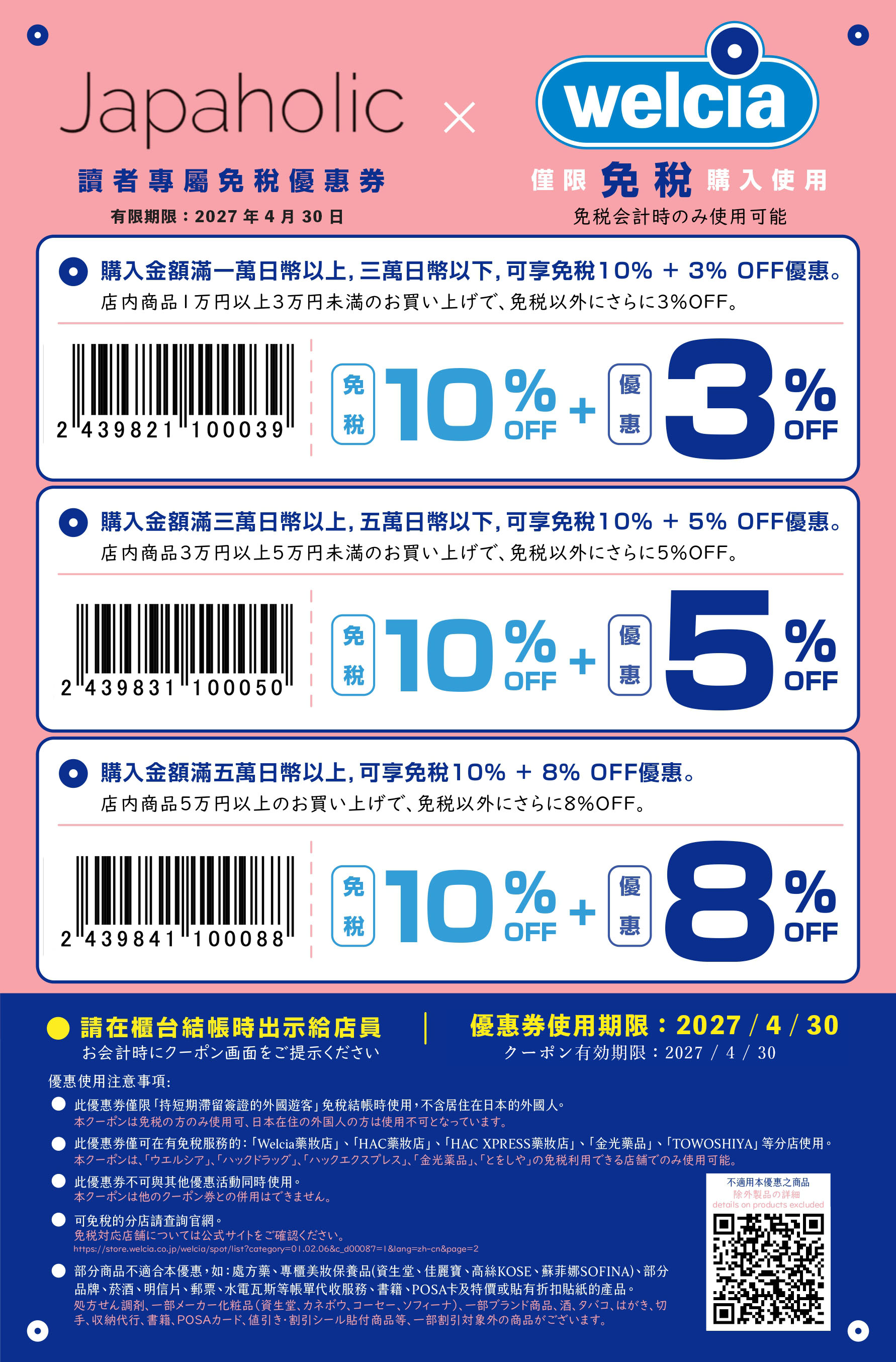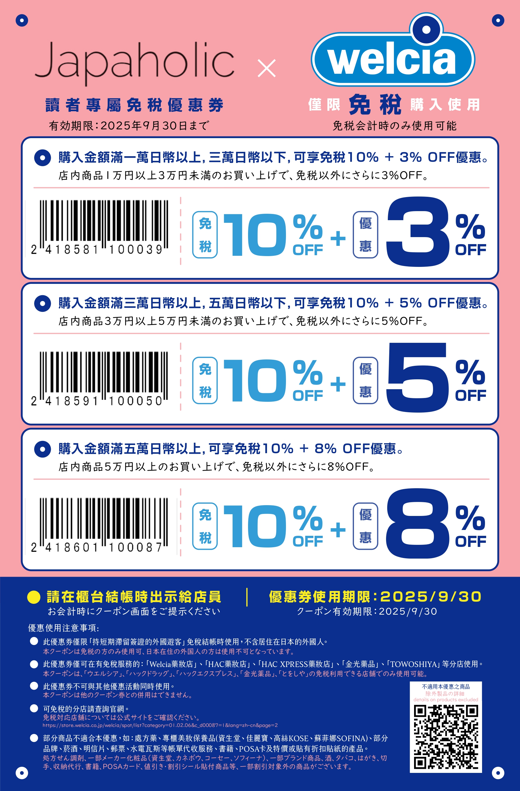 日本welcia藥妝店最高83折優惠券,滿額享有10%免稅+7%折扣雙重好禮