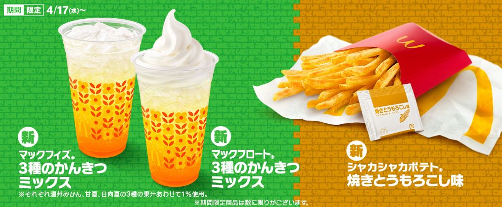 除此之外,因應本次連動,飲料及副餐方面也推出了不同的選擇!好比蘇打飲料系列的Mcfizz就推出了「マックフィズ® 3種のかんきつミックス」(暫譯:Mcfizz 3種柑橘綜合),漂浮冰淇淋系列的Mcfloat也一起推出了「マックフロート® 3種のかんきつミックス」(暫譯:Mcfloat 3種柑橘綜合),讓人可以在即將變熱的天氣中,享受到清爽又冰涼的飲品唷!在副餐方面,日本麥當勞則是推出了「シャカシャカポテト® 焼きとうもろこし味」(暫譯:薯條 烤玉米口味),結合了烤玉米的香氣以的薯條想必會讓原先就香氣十足又酥脆的薯條的風味更上一層樓!