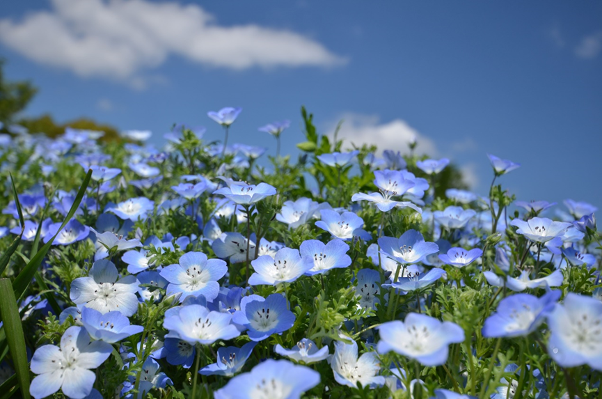 粉蝶花蘇來自北美的一年生草本花卉,日本名為瑠璃唐草。株高約20cm,花朵大小約2~3cm,本來為花園的配角,但數十萬株的藍色小花齊開卻美的引人入勝; 4月下旬至5月中旬是粉蝶花的最佳觀賞期,花開得像天空一樣清新湛藍,而可愛的粉蝶花就像鋪在大地上的藍色地毯,成就了昭和紀念公園最盛大的藝術之作。