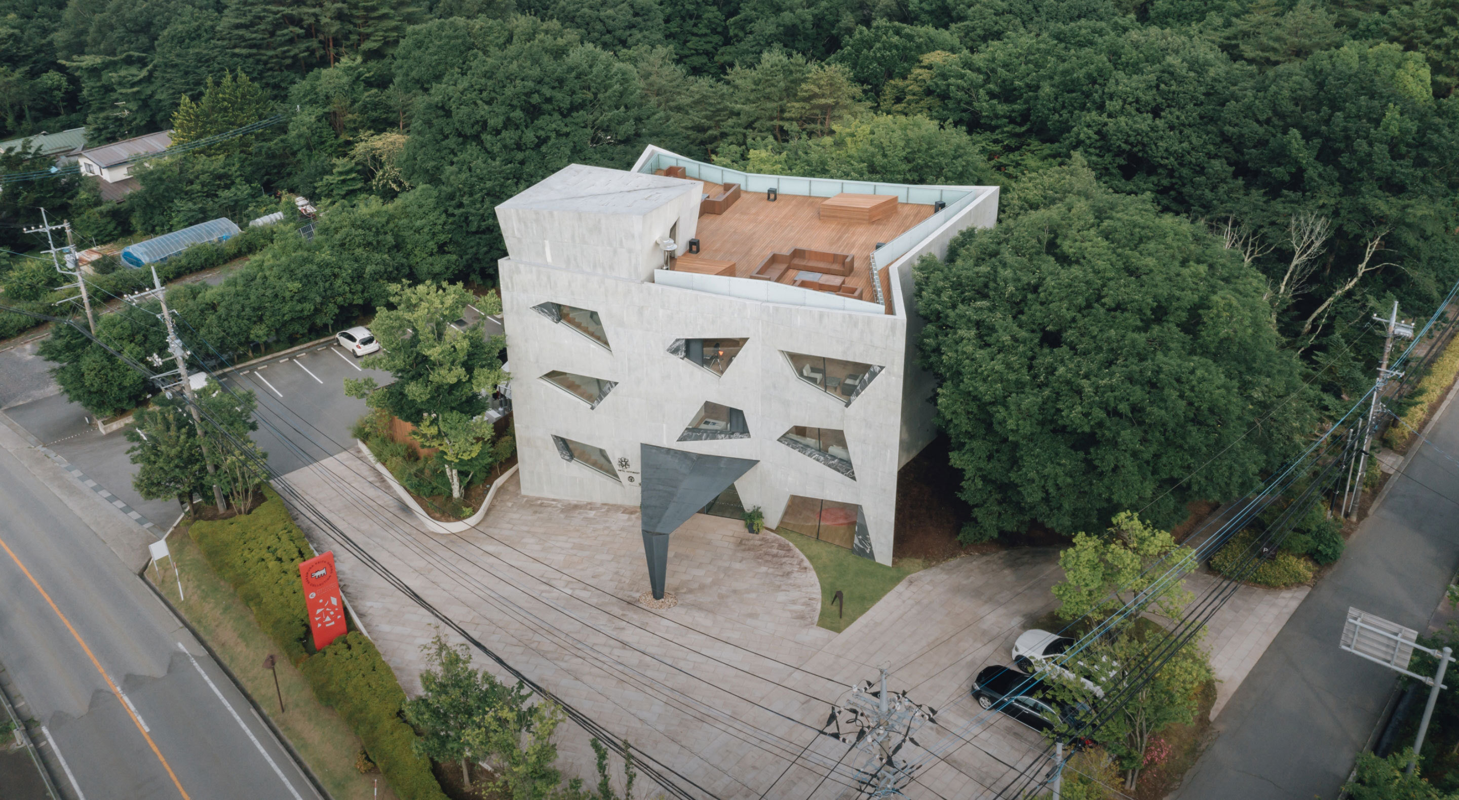 由出生於長野縣的詩人建築師北川原溫所設計,外牆採用露出的混凝土裝飾,呈現出梯形開口的規律排列,並以御影石作為點綴。設計保留了現有的樹木,使建築融入周圍的自然環境。館內陳列著各種藝術品,也是一大亮點。受到縄文時代的啟發,全棟六間客房皆使用繩紋時代表示自然景致的詞彙做命名,例如:UTSUO為山之意,而HANI則是森的意思。前衛又保有傳統價值的建築讓人眼睛為之一亮。