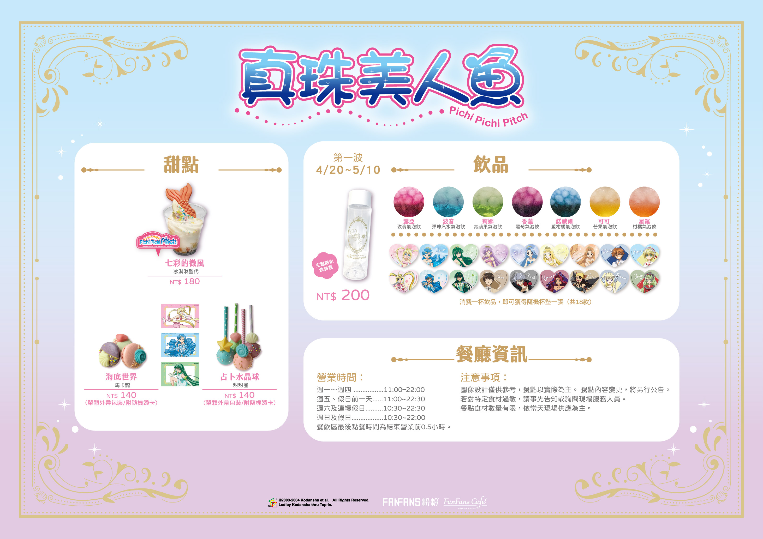 當然不能錯過以七位美人魚的代表色設計的七款不同顏色及口味的瓶裝氣泡飲!每瓶飲料都會使用主題限定瓶子。來店消費任一飲品,就送《真珠美人魚》角色杯墊乙張,這次更將特別推出第二波全新設計的杯墊,4月20日-5月10日將提供第一波杯墊(共18款隨機發送、恕不挑款),5月11日-6月10日開始提供全新的第二波杯墊(共10款隨機發送、恕不挑款),粉絲們趕快把握機會來蒐藏吧!