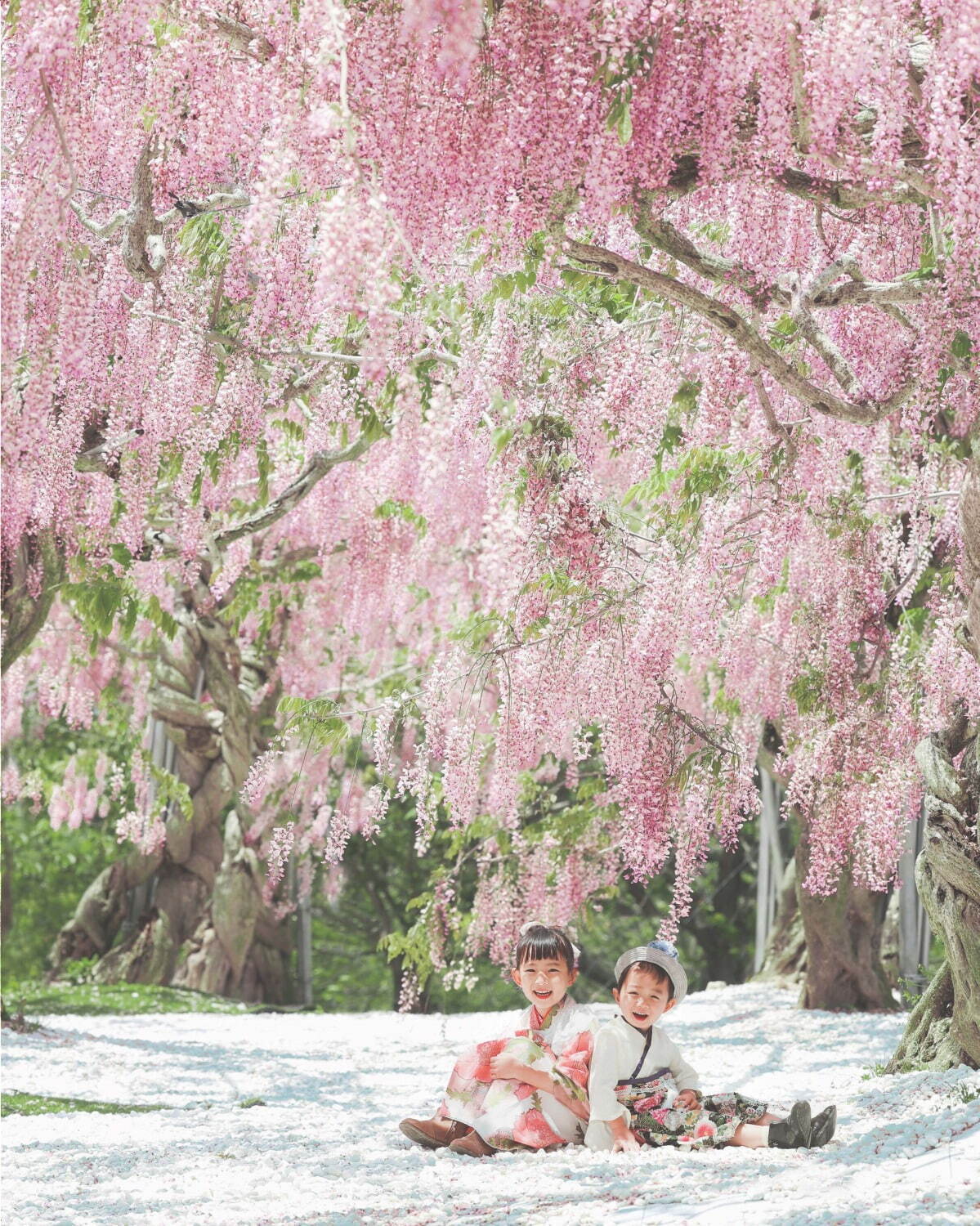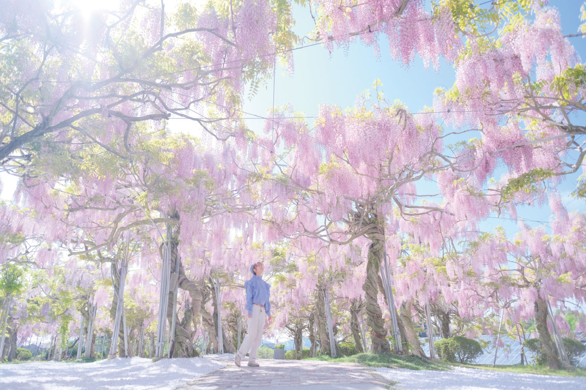 鋪設於地面的白石與藤花的桃紅色形成柔和對比,讓這裡成為了最受歡迎的打卡拍照景點,每年都有人特地前來打卡。站在這裡可以被藤花縫隙間灑落的陽光溫和地壟罩,在悠閒無比的空間裡享受緩慢的時光流逝。