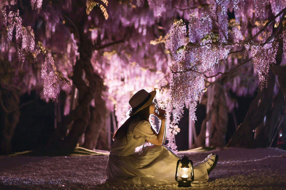 藤花和魯冰花的燈光秀活動。 夜晚打燈後展現的藤花美景與白天呈現完全不同的氛圍,是會讓人終生難忘的絕景。