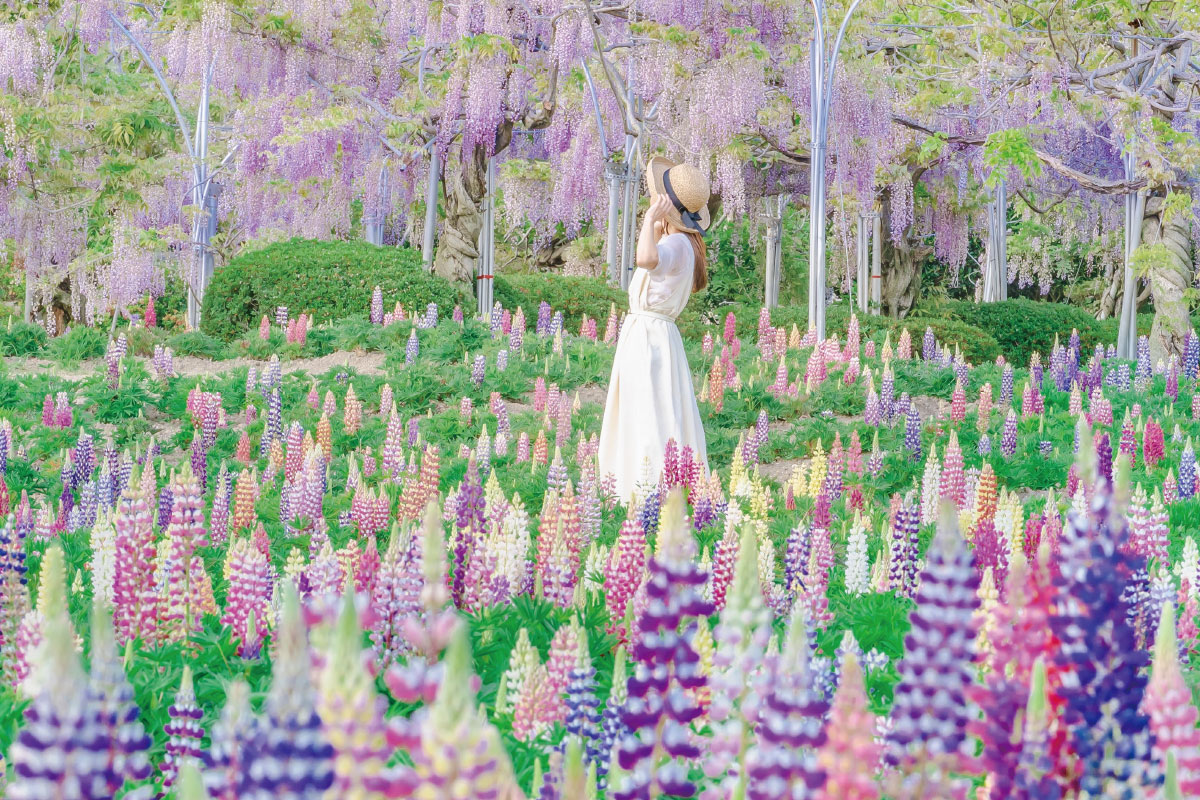 因為盛開時仿若藤蔓向天空攀升的模樣,所以日本將魯冰花又稱為「昇藤(昇り藤)」。今年園方擴大了魯冰花田的範圍,共有12,000株魯冰花一同盛開,在這裡可以同時欣賞垂掛綻放的藤花和向天空綻放的魯冰花,彷若置身童話之中。