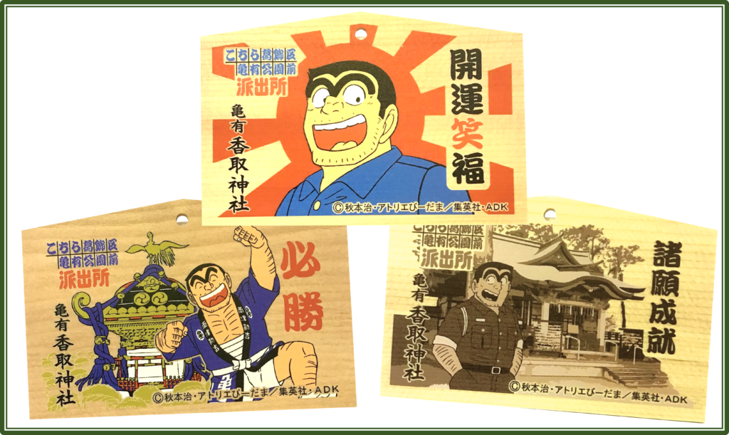 龜有地區因為長青動漫「烏龍派出所」受到國內以及海外的人們注目,所以龜有香取神社也推出了三款以主角兩津勘吉為主題的繪馬,共有「必勝」、「諸願成就」、「開運招福」三種主題。