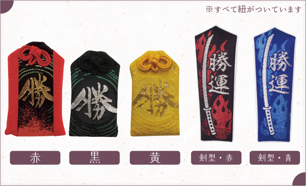 這個御守承載著「無論何事都能戰勝(何事にも打ち勝つ)」的願望。 在紅、黃、黑三色的編織圖案中心,「勝」字被特別的搶眼奪目。 而在紅色和藍色編織圖案中,則是一個縱向劍形的護身符。 在火焰的背景下,一把鋒利的劍閃耀著光芒,展現出強大的意念。