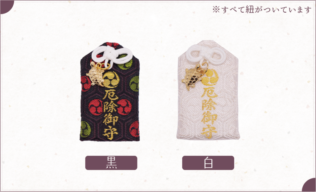 期許可以擺脫日常生活中的所有厄運,健康平安的度過每一天。共有【黑】【白】兩色,都是在龜甲紋樣中浮現出三個巴紋圖形(三つ巴),設計簡潔有力,且都會附上烏龜掛飾。