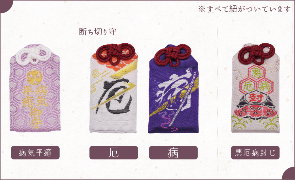 【厄】【病】分别是用來斷開厄運和疾病的御守,在文字上加入劍或閃電的圖案,感覺可以有效地斬除厄運和疾病。